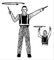 (Die rechte Hand beschreibt Kreisbewegungen in Kopfhöhe; die linke Hand wird senkrecht über den Kopf gehalten, und die Anzahl der ausgestreckten Finger dieser Hand zeigt die Nummer des anzulassenden Triebwerkes an; die Luftfahrzeugtriebwerke sind für diesen Zweck von rechts nach links – von dem vor dem Luftfahrzeug mit dem Gesicht zum Luftfahrzeug stehenden Einwinker gesehen – mit Nr. 1 beginnend nummeriert.)