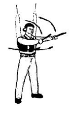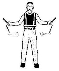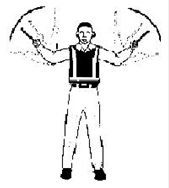 (Die seitwärts waagrecht ausgestreckten Arme werden mit nach unten gerichteten Handflächen von der Schulterhöhe wiederholt abwärts bewegt; die Geschwindigkeit der Armbewegung deutet die erforderliche Steiggeschwindigkeit an.)