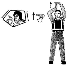 (Die seitwärts waagrecht ausgestreckten Arme werden mit nach oben gerichteten Handflächen von der Schulterhöhe wiederholt aufwärts bewegt; die Geschwindigkeit der Armbewegung deutet die erforderliche Steiggeschwindigkeit an.)