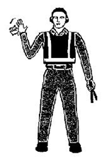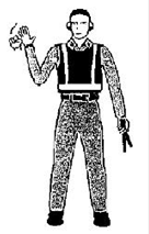 (Der rechte Arm wird auf Schulterhöhe mit geschlossener Faust angehoben, Wenn Blickkontakt mit der Cockpitbesatzung hergestellt wurde wird die Faust geöffnet und die offene Handfläche gezeigt. Anmerkung: Vor jeder weiteren Bewegung des Einwinkers muss das Lösen der Bremsen von der Cockpitbesatzung positiv bestätigt sein. |