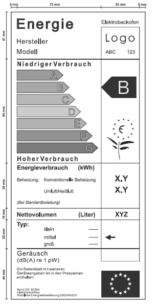 - Der Pfeil mit dem Kennzeichnungsbuchstaben darf nicht kleiner sein als der Pfeil mit Angabe der Energieeffizienzklasse, darf aber auch nicht mehr als doppelt so groß sein.