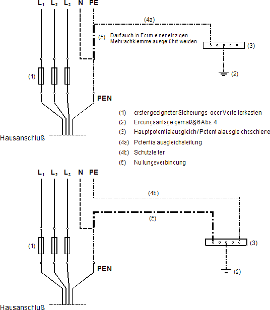 Für die Anordnung und Dimensionierung der Nullungsverbindung (5) bestehen je nach den örtlichen Verhältnissen einer Anlage grundsätzlich mehrere Möglichkeiten. Die Querschnittsdimensionierung hat gemäß § 6 Abs. 8 zu erfolgen. Beispielhaft wird in den tieferstehenden Prinzipschaltbildern dargestellt, wie der Anschluß des PEN-Leiters an den PE-Leiter bzw. an den Hauptpotentialausgleich vorzugsweise erfolgen kann.
