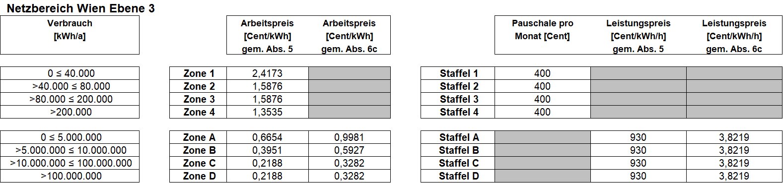 (4) Die Entgelte werden verbrauchs- und leistungsabhängig in Zonen bzw. Staffeln festgelegt. Die Zonen 1-4 sowie die Staffeln 1-4 kommen für nicht leistungsgemessene Anlagen, die Zonen A-F sowie die Staffeln A-F kommen für leistungsgemessene Anlagen zur Anwendung. Der Arbeitspreis wird für die Zonen 1-4 bzw. A-F so festgelegt, dass je nach Jahresverbrauch alle darunter liegenden Zonen durchlaufen werden. Der Leistungspreis wird in den Staffeln A-F bzw. 1-4 festgelegt, wobei der Leistungspreis der Staffel 1-4 als Pauschale bestimmt wird. Die Pauschalen der Staffeln 1-4 sind grundsätzlich auf einen Zeitraum von einem Monat zu beziehen. Ist der Abrechnungszeitraum kürzer oder länger als ein Monat, sind die Pauschalen der Staffeln 1-4 tageweise zu aliquotieren. Es können Zonen bzw. Staffeln zusammengefasst werden, sodass mehrere Zonen bzw. Staffeln denselben Arbeitspreis bzw. denselben Leistungspreis aufweisen können. Die Rechnungslegung hat entsprechend den tatsächlichen Ableseintervallen (§ 15 Abs. 3) zu erfolgen, § 126 Abs. 2 GWG 2011 bleibt davon unberührt.