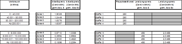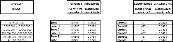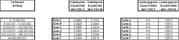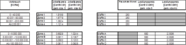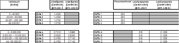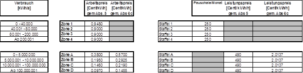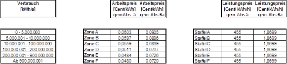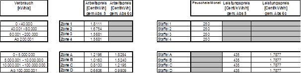 (4) Die Entgelte werden verbrauchs- und leistungsabhängig in Zonen bzw. Staffeln festgelegt. Die Zonen 1-4 sowie die Staffeln 1-4 kommen für nicht leistungsgemessene Anlagen, die Zonen A-F sowie die Staffeln A-F kommen für leistungsgemessene Anlagen zur Anwendung. Der Arbeitspreis wird für die Zonen 1-4 bzw. A-F so festgelegt, dass je nach Jahresverbrauch alle darunter liegenden Zonen durchlaufen werden. Der Leistungspreis wird in den Staffeln A-F bzw. 1-4 festgelegt, wobei der Leistungspreis der Staffel 1-4 als Pauschale bestimmt wird. Die Pauschalen der Staffeln 1-4 sind grundsätzlich auf einen Zeitraum von einem Monat zu beziehen. Ist der Abrechnungszeitraum kürzer oder länger als ein Monat, sind die Pauschalen der Staffeln 1-4 tageweise zu aliquotieren. Es können Zonen bzw. Staffeln zusammengefasst werden, sodass mehrere Zonen bzw. Staffeln denselben Arbeitspreis bzw. denselben Leistungspreis aufweisen können. Die Rechnungslegung hat entsprechend den tatsächlichen Ableseintervallen (§ 15 Abs. 3) zu erfolgen, § 126 Abs. 2 GWG 2011 bleibt davon unberührt.