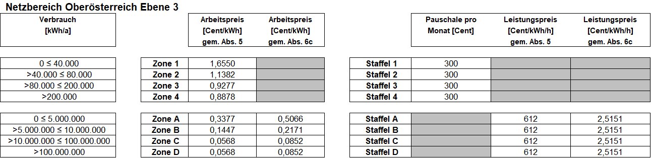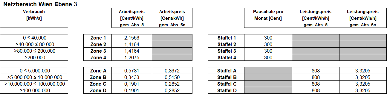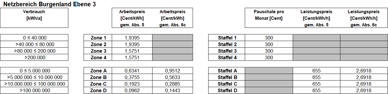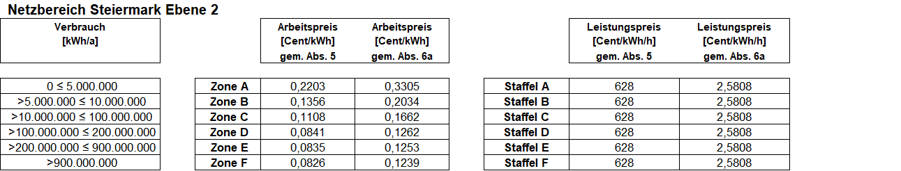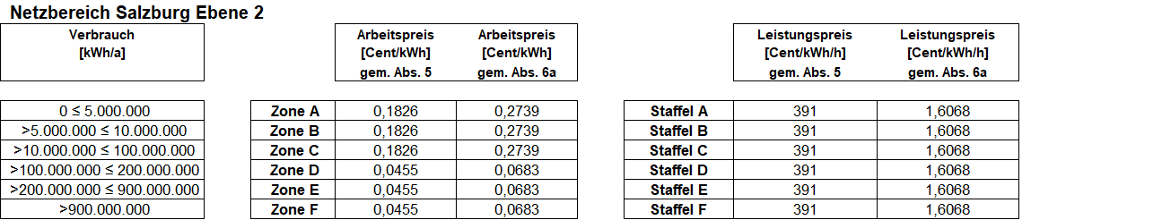 (4) Die Entgelte werden verbrauchs- und leistungsabhängig in Zonen bzw. Staffeln festgelegt. Die Zonen 1-4 sowie die Staffeln 1-4 kommen für nicht leistungsgemessene Anlagen, die Zonen A-F sowie die Staffeln A-F kommen für leistungsgemessene Anlagen zur Anwendung. Der Arbeitspreis wird für die Zonen 1-4 bzw. A-F so festgelegt, dass je nach Jahresverbrauch alle darunter liegenden Zonen durchlaufen werden. Der Leistungspreis wird in den Staffeln A-F bzw. 1-4 festgelegt, wobei der Leistungspreis der Staffel 1-4 als Pauschale bestimmt wird. Die Pauschalen der Staffeln 1-4 sind grundsätzlich auf einen Zeitraum von einem Monat zu beziehen. Ist der Abrechnungszeitraum kürzer oder länger als ein Monat, sind die Pauschalen der Staffeln 1-4 tageweise zu aliquotieren. Es können Zonen bzw. Staffeln zusammengefasst werden, sodass mehrere Zonen bzw. Staffeln denselben Arbeitspreis bzw. denselben Leistungspreis aufweisen können. Die Rechnungslegung hat entsprechend den tatsächlichen Ableseintervallen (§ 15 Abs. 3) zu erfolgen, § 126 Abs. 2 GWG 2011 bleibt davon unberührt.