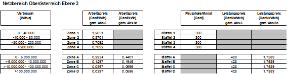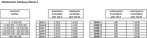 (4) Die Entgelte werden verbrauchs- und leistungsabhängig in Zonen bzw. Staffeln festgelegt. Die Zonen 1-4 sowie die Staffeln 1-4 kommen für nicht leistungsgemessene Anlagen, die Zonen A-F sowie die Staffeln A-F kommen für leistungsgemessene Anlagen zur Anwendung. Der Arbeitspreis wird für die Zonen 1-4 bzw. A-F so festgelegt, dass je nach Jahresverbrauch alle darunter liegenden Zonen durchlaufen werden. Der Leistungspreis wird in den Staffeln A-F bzw. 1-4 festgelegt, wobei der Leistungspreis der Staffel 1-4 als Pauschale bestimmt wird. Die Pauschalen der Staffeln 1-4 sind grundsätzlich auf einen Zeitraum von einem Monat zu beziehen. Ist der Abrechnungszeitraum kürzer oder länger als ein Monat, sind die Pauschalen der Staffeln 1-4 tageweise zu aliquotieren. Es können Zonen bzw. Staffeln zusammengefasst werden, sodass mehrere Zonen bzw. Staffeln denselben Arbeitspreis bzw. denselben Leistungspreis aufweisen können. Die Rechnungslegung hat entsprechend den tatsächlichen Ableseintervallen (§ 15 Abs. 3) zu erfolgen, § 126 Abs. 2 GWG 2011 bleibt davon unberührt.