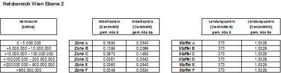 (1) Für das von Endverbrauchern sowie von Netzbetreibern innerhalb von Netzbereichen zu entrichtende Netznutzungsentgelt im Verteilernetz gemäß § 73 Abs. 2 GWG 2011 werden Entgelte, bestimmt, die, sofern nicht besonders ausgewiesen, in Cent/kWh pro Zählpunkt für den Arbeitspreis bzw. Cent/kWh/h pro Jahr und pro Zählpunkt für den Leistungspreis oder als Pauschale in Cent/Monat pro Zählpunkt angegeben werden. Für Anlagen, die an die Netzebene 1 angeschlossen sind, gelten die Entgelte der Netzebene 2. Ein Wechsel von Netzebene 3 auf Netzebene 2 für bereits an das Netz angeschlossene Anlagen ist nur zulässig, wenn aufgrund einer für den Betrieb der Anlage notwendigen technischen Änderung nachweislich ein Übergabedruck größer 6 bar erforderlich wird.