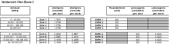 (4) Die Entgelte werden verbrauchs- und leistungsabhängig in Zonen bzw. Staffeln festgelegt. Die Zonen 1-4 sowie die Staffeln 1-4 kommen für nicht leistungsgemessene Anlagen, die Zonen A-F sowie die Staffeln A-F kommen für leistungsgemessene Anlagen zur Anwendung. Der Arbeitspreis wird für die Zonen 1-4 bzw. A-F so festgelegt, dass je nach Jahresverbrauch alle darunter liegenden Zonen durchlaufen werden. Der Leistungspreis wird in den Staffeln A-F bzw. 1-4 festgelegt, wobei der Leistungspreis der Staffel 1-4 als Pauschale bestimmt wird. Die Pauschalen der Staffeln 1-4 sind grundsätzlich auf einen Zeitraum von einem Monat zu beziehen. Ist der Abrechnungszeitraum kürzer oder länger als ein Monat, sind die Pauschalen der Staffeln 1-4 tageweise zu aliquotieren. Es können Zonen bzw. Staffeln zusammengefasst werden, sodass mehrere Zonen bzw. Staffeln denselben Arbeitspreis bzw. denselben Leistungspreis aufweisen können. Die Rechnungslegung hat entsprechend den tatsächlichen Ableseintervallen (§ 15 Abs. 3) zu erfolgen, § 126 Abs. 2 GWG 2011 bleibt davon unberührt.