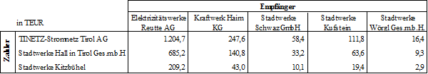 (4) Für den Netzbereich Tirol werden folgende Ausgleichszahlungen festgelegt, wobei die Zahlungen zwischen den einzelnen Netzbetreibern gemäß folgender Aufstellung zu leisten sind: