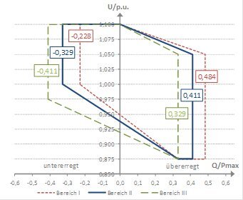 Es gilt grundsätzlich der Blindleistungsbereich II (entspricht bei 1 p.u. einem Leistungsfaktor von 0,95 untererregt bis 0,925 übererregt).