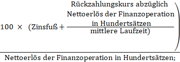 - d) die prozentuelle Gesamtbelastung bei Anleihen, Darlehen und sonstigen Krediten inländischer Währung unter Zugrundelegung der folgenden Formel nicht mehr als das Zweieinhalbfache des im Zeitpunkt der Finanzoperation geltenden Zinsfußes für Eskontierungen der Oesterreichischen Nationalbank (Anm.: Basiszinssatzes) (§ 48 Abs. 2 des Nationalbankgesetzes 1955, BGBl. Nr. 184, in der Fassung des Bundesgesetzes BGBl. Nr. 276/1969) beträgt;