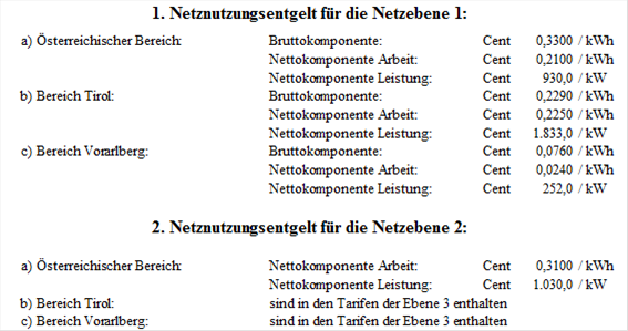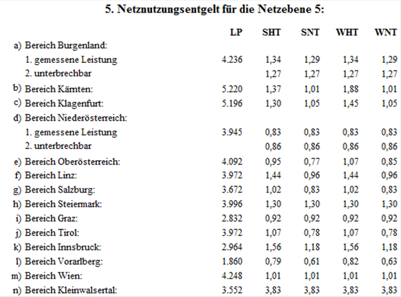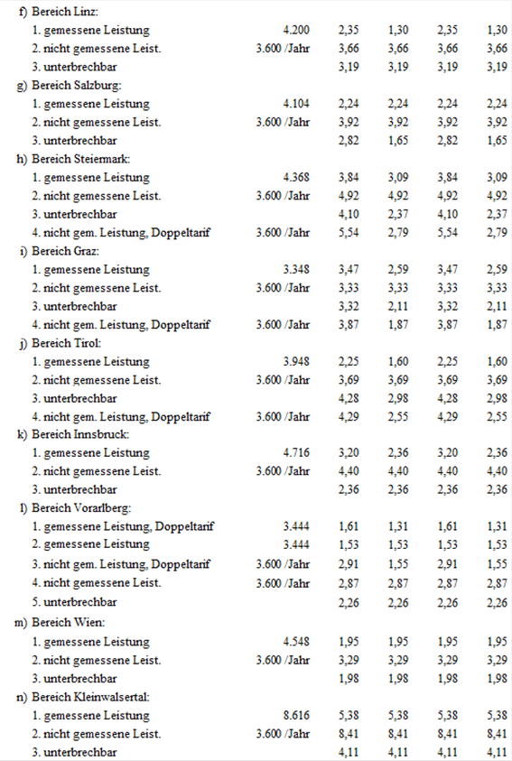 (2) Für die Netznutzung der Netzebene 3 der Austrian Power Grid AG sind folgende Jahresbeträge (in tausend Euro – TEUR) in zwölf gleichen Teilbeträgen monatlich zu leisten, wobei alle Rechnungen am 15. des dem Leistungserbringungsmonat folgenden Monats fällig sind: