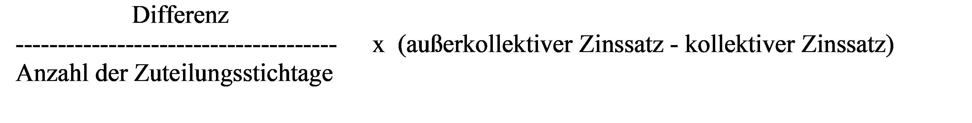 (2) Der außerkollektive Zinssatz ist aus den Zinserträgen der Veranlagung in Zwischendarlehen (§ 8 Abs. 2 Bausparkassengesetz) und aus der Veranlagung nach § 8 Abs. 3 Bausparkassengesetz zu errechnen. Der kollektive Zinssatz entspricht dem für Bauspardarlehen geltenden Zinssatz.