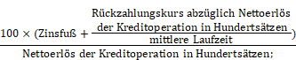 4. d) die prozentuelle Gesamtbelastung bei Anleihen, Darlehen und sonstigen Krediten in inländischer Währung unter Zugrundelegung der folgenden Formel nicht mehr als das Zweieinhalbfache des im Zeitpunkt der Kreditaufnahme geltenden Zinsfußes für Eskontierungen der Oesterreichischen Nationalbank (Anm.: Basiszinssatzes) (§ 48 Abs. 2 des Nationalbankgesetzes 1955, BGBl. Nr. 184, in der Fassung des Bundesgesetzes BGBl. Nr. 276/1969) beträgt: