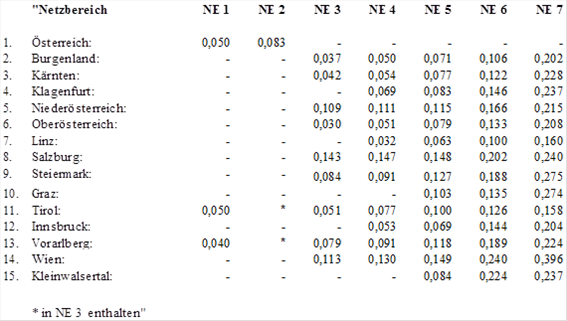 Für das von Entnehmern und Einspeisern pro Zählpunkt zu entrichtende Netzverlustentgelt werden jeweils folgende Entgelte bestimmt. Die Entgelte werden in Cent/kWh angegeben und gelten für die jeweilige Netzebene (NE).