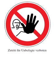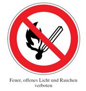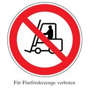 Form: rund; schwarzes Piktogramm auf weißem Grund, Rand und Querbalken (von links oben nach rechts unten in einem Neigungswinkel von 45° zur Horizontalen) rot; die Sicherheitsfarbe Rot muss mindestens 35% der Oberfläche des Zeichens ausmachen.