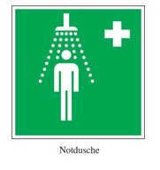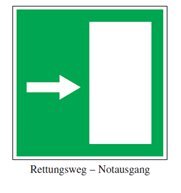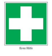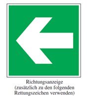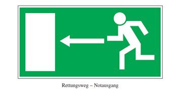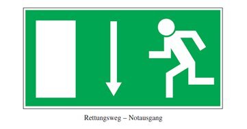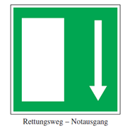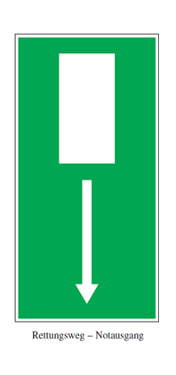 Form: rechteckig oder quadratisch; weißes Piktogramm auf grünem Grund; die Sicherheitsfarbe Grün muss mindestens 50% der Oberfläche des Zeichens ausmachen.