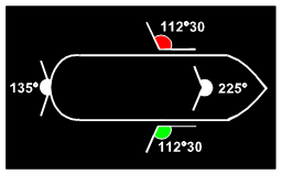 auf der Seite, an der die Vorbeifahrt frei ist, zwei grüne gewöhnliche Lichter oder zwei grüne helle Lichter übereinander und auf der Seite, an der die Vorbeifahrt nicht frei ist, ein von allen Seiten sichtbares rotes gewöhnliches Licht oder ein rotes helles Licht |