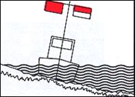 | auf der Seite, an der die Vorbeifahrt frei ist, eine Flagge oder eine Tafel, obere Hälfte rot, untere Hälfte weiß, und erforderlichenfalls auf der Seite, an der die Vorbeifahrt nicht frei ist, eine rote Flagge oder Tafel |