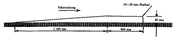 1 km/h) über eine Schwelle von 80 mm Höhe mit dem in Abbildung 1 gezeigten Profil gefahren werden; auf Frequenz und Dämpfung ist die kurzzeitige Schwingung zu untersuchen, die sich ergibt, nachdem die Räder an der Antriebsachse die Schwelle wieder verlassen haben; oder