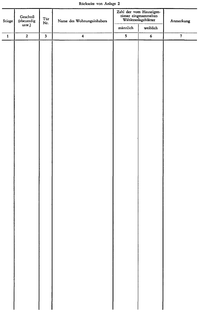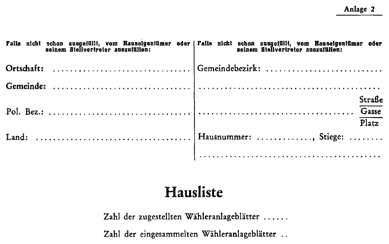 2. Die Hauseigentümer oder ihre Stellvertreter haben die Namen der Wohnungsinhaber, gegebenenfalls nach Lage und Türnummer der Wohnung geordnet, in die umseitige Liste einzutragen und die Wähleranlageblätter sofort an die in jeder Wohnung befindlichen zur Ausfüllung eines Wähleranlageblattes verpflichteten Personen zu verteilen.