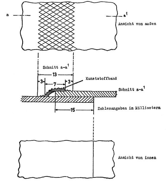 (4) Besteht die Schutzdecke aus kunststoffbeschichtetem Gewebe und ist sie aus mehreren Stücken zusammengesetzt, so können diese Stücke auch durch Verschweißen entsprechend der diesen Vorschriften beigefügten Zeichnung 3 aneinandergefügt werden. Dabei müssen sich die Ränder der Stücke um mindestens 15 mm überlappen. Sie müssen in der vollen Breite der 15 mm miteinander verschmolzen sein. Auf der Außenseite ist die Überlappkante mit einem mindestens 7 mm breiten Kunststoffband im selben Schweißvorgang zu überdecken. Das Kunststoffband und ein Streifen von mindestens 3 mm zu beiden Seiten dieses Bandes sind mit einer gleichförmigen und deutlich sichtbaren Narbung zu versehen. Das Verschweißen muß so ausgeführt sein, daß die Stücke nicht getrennt und danach wieder zusammengefügt werden können, ohne sichtbare Spuren zu hinterlassen.