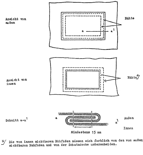 (3) Ist die Schutzdecke aus mehreren Stücken zusammengesetzt, so müssen die Ränder der Stücke ineinandergefaltet und durch zwei mindestens 15 mm voneinander entfernte Nähte miteinander verbunden sein. Die Nähte müssen entsprechend der diesen Vorschriften beigefügten Zeichnung 1 ausgeführt sein; wenn es jedoch bei gewissen Teilen der Schutzdecke (wie z. B. bei Überfällen und verstärkten Ecken) nicht möglich ist, die Stücke auf diese Weise zusammenzunähen, so genügt es, daß nur der Rand des oberen Teiles umgefaltet und entsprechend der diesen Vorschriften beigefügten Zeichnung 2 oder 2a angenäht ist. Die eine Naht, deren Faden sich in der Farbe vom Faden der anderen Naht und von der Schutzdecke deutlich unterscheiden muß, darf nur an der Innenseite sichtbar sein. Alle Nähte müssen mit der Maschine genäht sein.