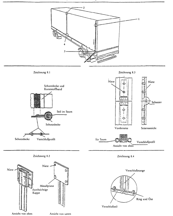 Bei diesem Verschlußsystem werden die beiden Ränder an den Öffnungen der Schutzdecke, die zum Beladen und Entladen dienen, mit einer Verschlußstange aus Aluminium verbunden. Die Öffnungen der Schutzdecke sind über ihre ganze Länge mit einem durch einen Saum geführten Seil versehen (Zeichnung 8.1), so daß die Schutzdecke nicht aus dem Verschlußprofil gezogen werden kann. Der Saum ist an der Außenseite angebracht und entsprechend Anlage 2 Artikel 3 Absatz 4 verschweißt. Die Ränder werden in die offenen Profile der Verschlußstange aus Aluminium eingeführt und in zwei über die ganze Länge parallellaufende Kanäle geschoben, die an ihren unteren Enden geschlossen sind. Befindet sich die Verschlußstange in senkrechter Stellung, sind die Ränder der Schutzdecke miteinander verbunden. Die Verschlußstange wird am oberen Ende der Öffnung durch eine an die Schutzdecke genietete durchsichtige Kunststoffkappe gesichert (Zeichnung 8.2). Die Verschlußstange besteht aus zwei Teilen, die durch ein vernietetes Scharnier verbunden sind, so daß sie durch Zusammenklappen einfacher angebracht oder entfernt werden kann. Dieses Scharnier muß so beschaffen sein, daß der Scharnierbolzen bei angelegtem Zollverschluß nicht entfernt werden kann (Zeichnung 8.3). Am unteren Ende der Verschlußstange befindet sich eine Öffnung, durch die der Ring geführt wird. Die Öffnung ist oval und so klein, daß der Ring gerade durchgesteckt werden kann (Zeichnung 8.4). Das TIR-Verschlußseil wird durch diesen Ring gezogen, um die Verschlußstange zu sichern.