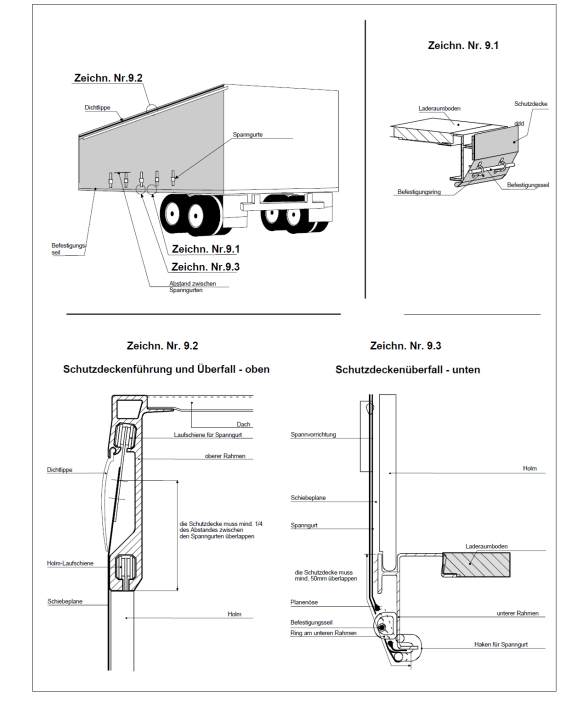 - Die Schutzdecke muß den festen Teil des Fahrzeugs um mindestens 250 mm, von der Mitte der Befestigungsringe an gemessen, überdecken, sofern nicht schon die Art der Konstruktion des Fahrzeugs als solche jeden Zugang zum Laderaum verhindert.