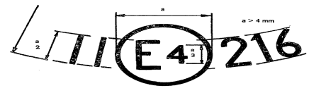 Das Prüfzeichen ist in der Nähe des Kreises anzubringen, der den Buchstaben „E“ umschließt, und zwar in beliebiger Lage zu diesem Kreis. Die Zahlen, aus denen das Prüfzeichen besteht, müssen in ihrer Lage dem Buchstaben „E“ entsprechen. Die römischen Zahlen, welche die Klassen angeben, müssen gegenüber der Prüfnummer angeordnet sein. Die zuständigen Behörden sollen als Prüfnummern die Zahlen 1, 11 und 111 nicht zuteilen, da diese Zahlen mit den Zeichen der Klassen I, II und III verwechselt werden können.