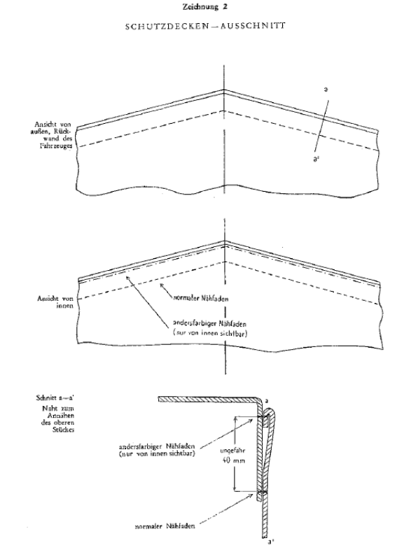 - 12. An den Öffnungen, die zum Beladen und Entladen des Fahrzeuges dienen, müssen die beiden Ränder der Schutzdecke einander in genügender Weise überlappen. Außerdem muß ihr Verschluß durch einen außen angebrachten und entsprechend dem Absatz 3 angenähten Überfall gesichert sein. Außer den in Absatz 6 vorgesehenen Befestigungsmitteln können auch Lederriemen zugelassen werden, wenn sie mindestens 20 mm breit und 3 mm dick sind. Diese Riemen müssen an der Innenseite der Schutzdecke befestigt und mit Ösen zur Aufnahme der in Absatz 8 angeführten Drahtseile, Seile oder Stangen versehen sein.