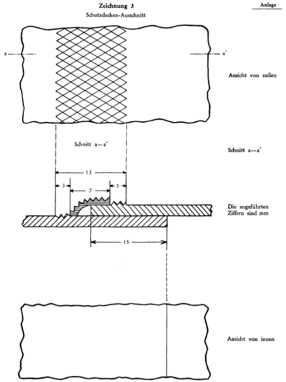- 4. Lichtöffnungen sind zulässig, sofern sie mit einer festen Glasscheibe und einem festen Metallgitter versehen sind, die von außen nicht entfernt werden können. Die Maschenweite des Gitters darf höchstens 10 mm betragen.