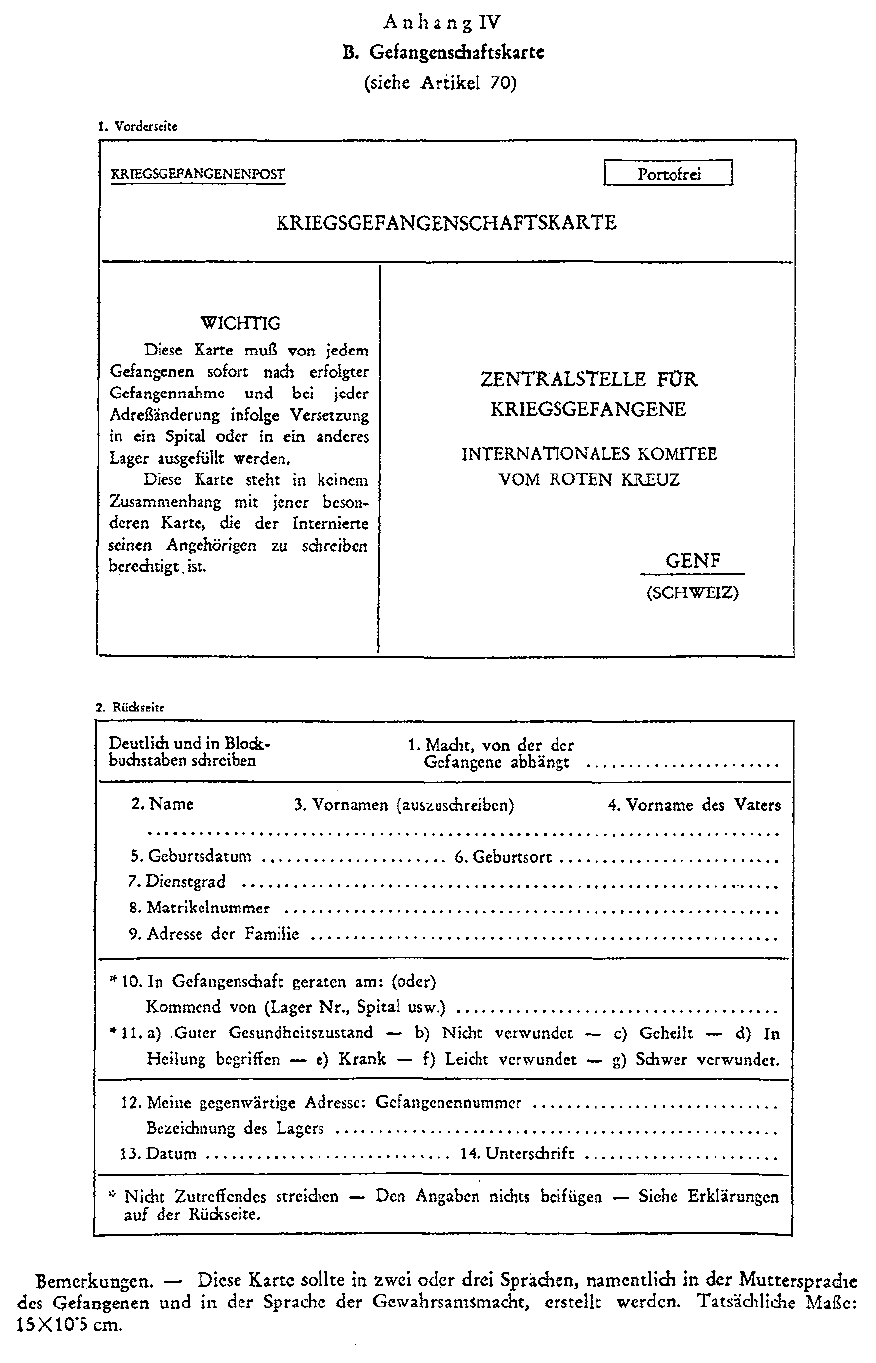Anlage 4 Genfer Abkommen über die Behandlung der Kriegsgefangenen