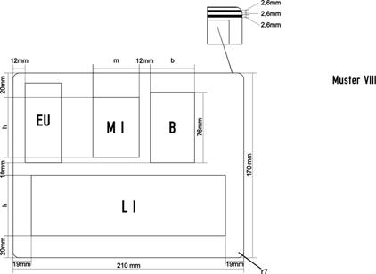 B | I ,III, VII, VIII | Bundeswappen oder Wappen des Bundeslandes mit unterhalb ausgeschriebenem Namen des Bundeslandes (Blockbuchstaben, Höhe: 4 mm oder 5 mm je nach Wortlänge) thermoplastisch aufgebracht. | |