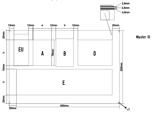 B | I ,III, VII, VIII | Bundeswappen oder Wappen des Bundeslandes mit unterhalb ausgeschriebenem Namen des Bundeslandes (Blockbuchstaben, Höhe: 4 mm oder 5 mm je nach Wortlänge) thermoplastisch aufgebracht. | |