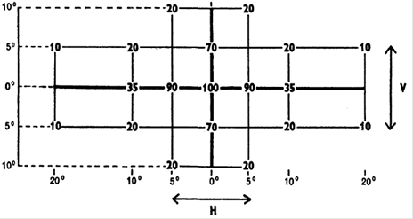 1. 2.1. Die Richtung H = 0° und V = 0° entspricht der Bezugsachse (sie verläuft am Fahrzeug waagerecht und parallel zur Fahrzeuglängsmittelebene in Richtung der verlangten Sichtbarkeit). Sie geht durch den Bezugspunkt. Die in der Tabelle angegebenen Werte geben für die verschiedenen Meßrichtungen die Mindestwerte in Prozent des für jede Leuchte geforderten Mindestwerts in der Achse (Richtung H = 0° und V = 0°) an