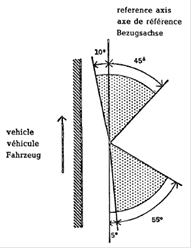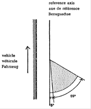 In allen Fällen betragen die lotrechten Mindestwinkel der räumlichen Lichtverteilung der Fahrtrichtungsanzeiger ausgehend von der Waagerechten 15° nach oben und 15° nach unten.