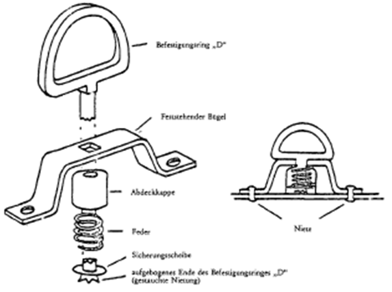 | Drehbare Befestigungsringe aus Metall, die sich jeweils in einem am Fahrzeug befestigten Bügel drehen, sind für die Zwecke dieses Absatzes zulässig (siehe Zeichnung 2 a dieser Anlage) sofern