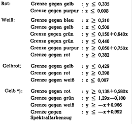 Zur Feststellung dieser Farbmerkmale ist eine Lichtquelle der Farbtemperatur von 2854° K entsprechend Normlichtart A der Internationalen Beleuchtungskommission (C1E) zu verwenden.