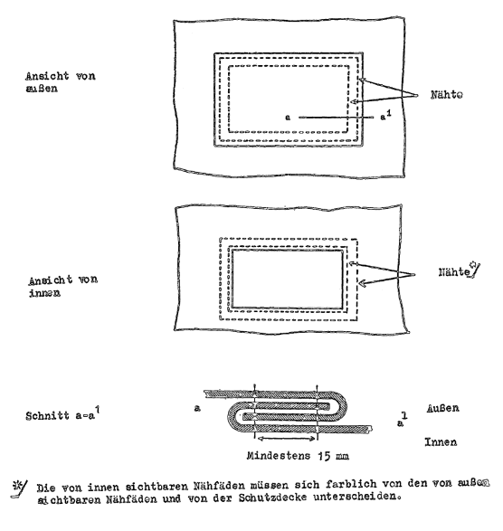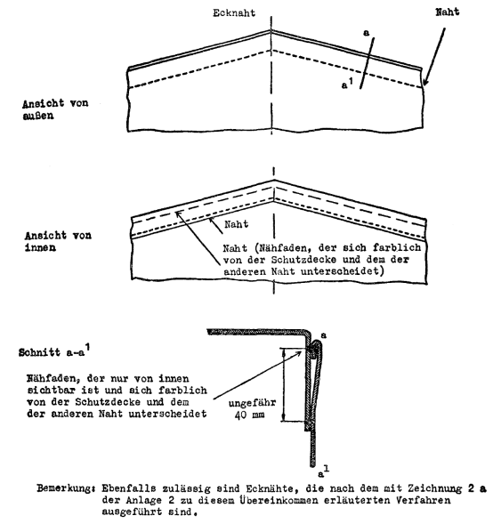 (3) Ist die Schutzdecke aus mehreren Stücken zusammengesetzt, so müssen die Ränder der Stücke ineinandergefaltet und durch zwei mindestens 15 mm voneinander entfernte Nähte miteinander verbunden sein. Die Nähte müssen entsprechend der diesen Vorschriften beigefügten Zeichnung 1 ausgeführt sein; wenn es jedoch bei gewissen Teilen der Schutzdecke nicht möglich ist, die Stücke auf diese Weise zusammenzunähen, so genügt es, daß nur der Rand des oberen Teiles umgefaltet und entsprechend der diesen Vorschriften beigefügten Zeichnung 2 angenäht ist. Die eine Naht, deren Faden sich in der Farbe vom Faden der anderen Naht und von der Schutzdecke deutlich unterscheiden muß, darf nur an der Innenseite sichtbar sein. Alle Nähte müssen mit der Maschine genäht sein.