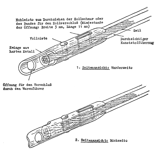 (10) Jedes Seil, gleich welcher Art, muss aus einem einzigen Stück bestehen und an beiden Enden mit einer Zwinge aus hartem Metall versehen sein. An jeder Zwinge muss die Zollschnur oder das Band für den Zollverschluss durchgezogen werden können. Die Befestigungsvorrichtung jeder Zwinge an den Enden von Seilen nach Absatz 9 Buchstaben a, b und d muss eine durch das Seil gehende Hohlniete enthalten, durch die die Zollschnur oder das Band für den Zollverschluss durchgezogen werden kann. Das Seil muss auf beiden Seiten der Hohlniete sichtbar sein, damit festgestellt werden kann, ob es aus einem einzigen Stück besteht (siehe die diesen Vorschriften beigefügte Zeichnung 5).