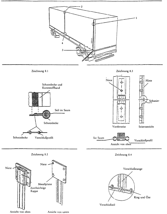 Bei diesem Verschlußsystem werden die beiden Ränder an den Öffnungen der Schutzdecke, die zum Beladen und Entladen dienen, mit einer Verschlußstange aus Aluminium verbunden. Die Öffnungen der Schutzdecke sind über ihre ganze Länge mit einem durch einen Saum geführten Seil versehen (Zeichnung 8.1), so daß die Schutzdecke nicht aus dem Verschlußprofil gezogen werden kann. Der Saum ist an der Außenseite angebracht und entsprechend Anlage 2 Artikel 3 Absatz 4 verschweißt. Die Ränder werden in die offenen Profile der Verschlußstange aus Aluminium eingeführt und in zwei über die ganze Länge parallellaufende Kanäle geschoben, die an ihren unteren Enden geschlossen sind. Befindet sich die Verschlußstange in senkrechter Stellung, sind die Ränder der Schutzdecke miteinander verbunden. Die Verschlußstange wird am oberen Ende der Öffnung durch eine an die Schutzdecke genietete durchsichtige Kunststoffkappe gesichert (Zeichnung 8.2). Die Verschlußstange besteht aus zwei Teilen, die durch ein vernietetes Scharnier verbunden sind, so daß sie durch Zusammenklappen einfacher angebracht oder entfernt werden kann. Dieses Scharnier muß so beschaffen sein, daß der Scharnierbolzen bei angelegtem Zollverschluß nicht entfernt werden kann (Zeichnung 8.3). Am unteren Ende der Verschlußstange befindet sich eine Öffnung, durch die der Ring geführt wird. Die Öffnung ist oval und so klein, daß der Ring gerade durchgesteckt werden kann (Zeichnung 8.4). Das TIR-Verschlußseil wird durch diesen Ring gezogen, um die Verschlußstange zu sichern.