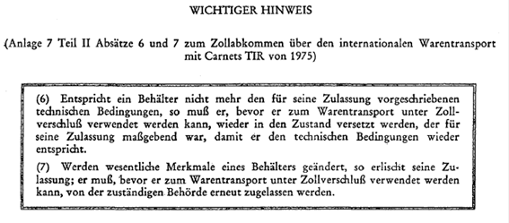 VORSCHRIFTEN ÜBER DIE TECHNISCHEN BEDINGUNGEN FÜR BEHÄLTER, DIE ZUM INTERNATIONALEN TRANSPORT UNTER ZOLLVERSCHLUSS ZUGELASSEN WERDEN KÖNNEN