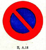 1. Das Zeichen [Signal] „BESCHRÄNKUNG FÜR HALTEN ODER PARKEN" (II, A. 18) bezeichnet die Stellen, wo Fahrzeuge nicht halten oder nicht oder nur für beschränkte Dauer parken dürfen. Das Mittelfeld der Scheibe ist blau; sie hat einen roten schrägen Querbalken und einen roten Rand.