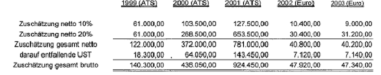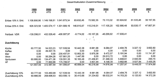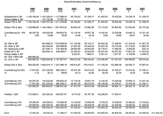 Tz. 1 BuchführungsmängelFür den gesamten Prüfungszeitraum 1999-2005 sowie für den USt-Nachschauzeitraum 1/2006-9/2007 konnten weder Grundaufzeichungen zur Losungsermittlung noch Inventuren vorgelegt werden.Für das Prüfungsjahr 1999 konnten außerdem auch keine Belegsammlung sowie keine Speisekarten vorgelegt werden.Tz. 2 Vermögensdeckungsrechnungln den Jahren 1999, sowie 2002 bis 2005 wurden vom Gesellschafter-Geschäftsführer B C-D Einlagen in das Unternehmen geleistet, deren Herkunft bis zur Schlußbesprechung nicht aufgeklärt werden konnten.Tz. 3 KalkulationsdifferenzenBei einer detaillierten Spartenkalkulation wurden durch die BP im gesamten Prüfungszeitraum, sowie im Nachschauzeitraum Differenzen festgestellt, die auch im Zuge der Schlußbesprechung nicht aufgeklärt werden konnten.Tz. 4 WareneinkaufsverkürzungTz. 5 Zuschätzung