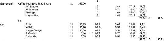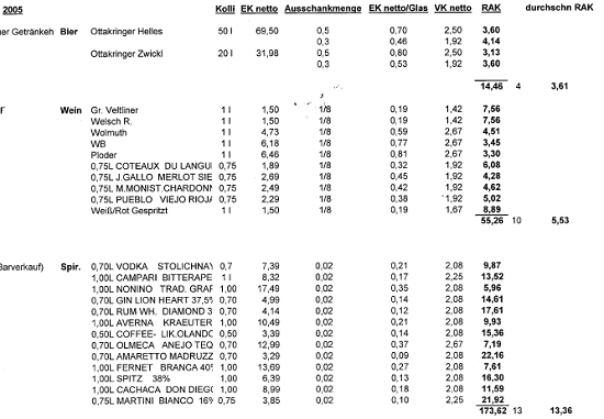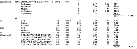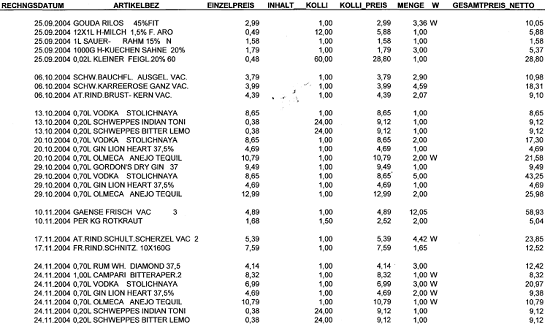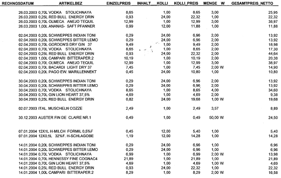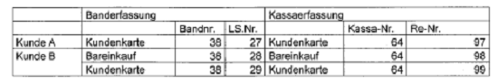 ... indet ein Bareinkauf praktisch gleichzeitig (innerhalb einer Rechnungsminute) mit einem Karteneinkauf am selben Band bei derselben Kasse über einen für den Abgabepflichtigen typischen Warenkorb statt, dann ist es sehr wahrscheinlich, dass dieser Einkauf ein und demselben Einkäufer zuzuordnen ist, selbst wenn die Einkäufe nicht "verschränkt" sind. Besondere Bedeutung kommen in diesem Fall charakteristischen, immer wiederkehrenden Produkten oder Mengen zu. So unterscheidet sich der Warenkorb eines Kantineurs recht deutlich von dem eines Hoteliers oder Pensionsbetreibers....