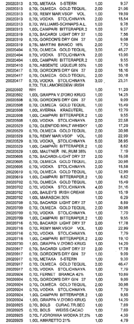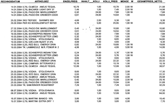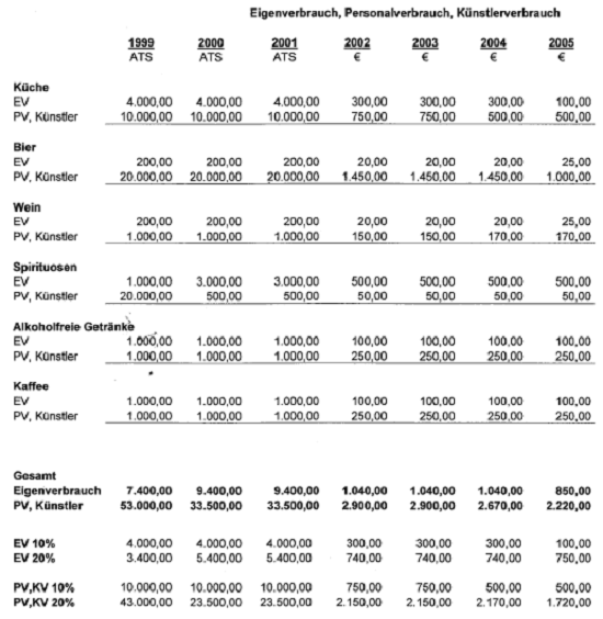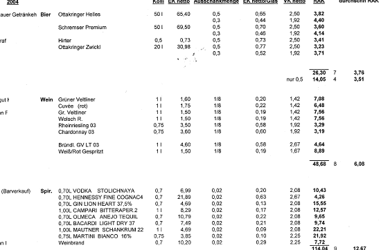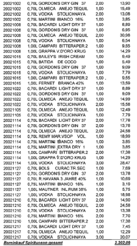 Auch wurden die Verdächtigten beispielsweise nicht gefragt, aus welchen Gründen der angeblich private Konsum des Kochs (laut in der Berufung wiedergegebener Einkaufsliste) weitgehend mit dem Getränkeangebot laut Speisekarte ident war. Der Koch hätte auch glaubhaft darlegen müssen, dass er privat diese unterschiedlichsten Getränke in dem angegebenen Umfang konsumiert hat.