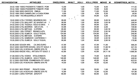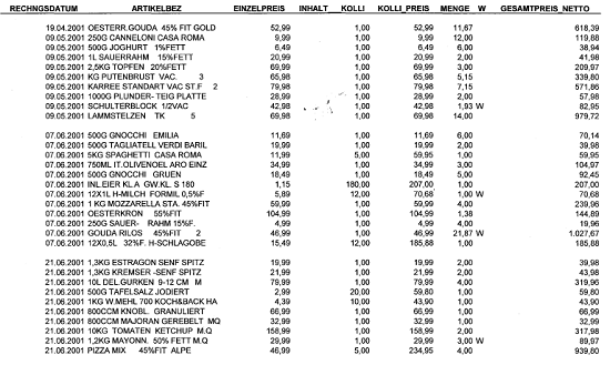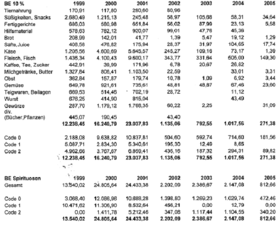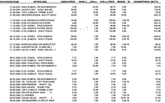 Man kann zwar aus Ausführungen in der Berufung und in der Stellungnahme bestimmte Rückschlüsse auf die strittigen Einkäufe ziehen, eine vollständige Darstellung ist jedoch in den vorliegenden Unterlagen nicht enthalten.