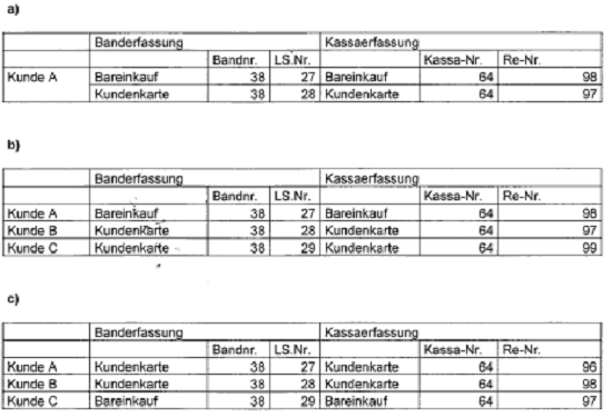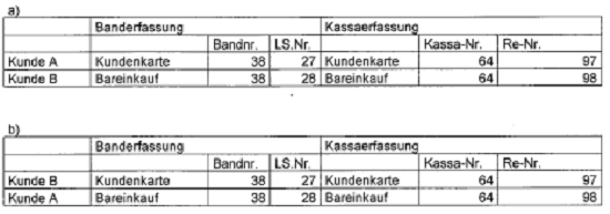 ... Ein besonders enger Zusammenhang zwischen einzelnen Bar- und Rechnungseinkäufen kommt nach den Feststellungen des Senats in den sog. Verschränkungsfällen zum Ausdruck. In diesen werden bei einem kombinierten bzw. aufgeteilten Einkauf die Kundenkarte und die extra eingesetzte Barverkaufskarte beim Erfassen der Waren auf dem Band in anderer Reihenfolge als danach bei der Zahlkasse eingelesen, wobei der Kassiererin von der Erfasserin die beiden Karten mit dem Vermerk weitergegeben werden, dass die beiden Vorgänge zusammengehören. Das vertauschte Einlesen der beiden Karten führte dazu, dass - anders als in allen anderen Fällen - Erfassungsnummer und Rechnungsnummer gleichsam vertauscht wurden und chronologisch nicht mehr korrespondieren...