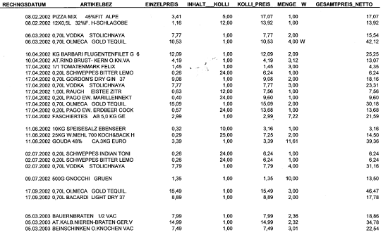 Wenn ich gefragt werde, wofür die Einkäufe verwendet wurden, die ich über Barverkauf getätigt habe, gebe ich an, dass diese zum Großteil für den Eigenbedarf bzw. für Bekannte getätigt wurden. Lebensmittel habe ich fast gar nicht für den Eigenbedarf gekauft, zumeist waren es Spirituosen wie Wodka, Bacardi oder auch alkoholfreie Getränke wie Pago Erdbeere. Den Alkohol habe ich selber konsumiert, ich war im Jahre 2006/2007 in einer Selbsthilfegruppe für die anonymen Alkoholiker. Ich hatte damals auch familiäre Probleme.